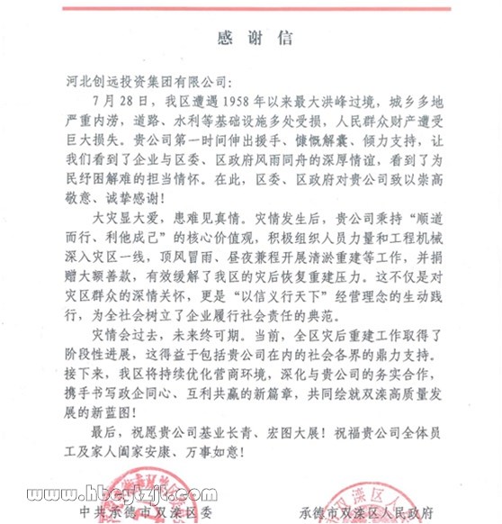 近日,承德市雙灤區(qū)區(qū)委、區(qū)政府向河北創(chuàng)遠(yuǎn)投資集團發(fā)來感謝信,對創(chuàng)遠(yuǎn)集團在今年抗洪搶險期間第一時間伸出援手、與區(qū)委、區(qū)政府和當(dāng)?shù)厝罕婏L(fēng)雨同舟的深厚情誼,表達了誠摯的感謝。